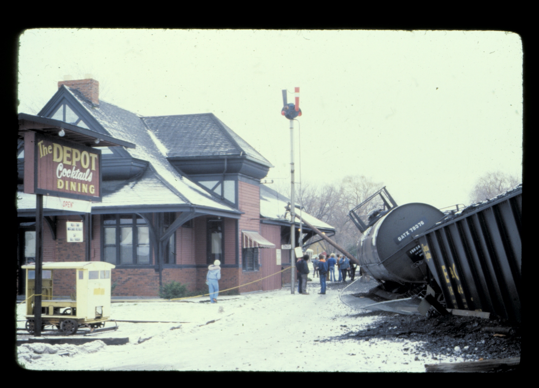Grand Trunk freight train derails in front of the depot, with tank cars tipping over near the attached freight warehouse. Fortunately, the depot itself is not seriously damaged. During track repairs, Grand Trunk uses the opportunity to remove excess sidings around the depot, leaving only the main line and one short spur, as freight traffic has diminished.