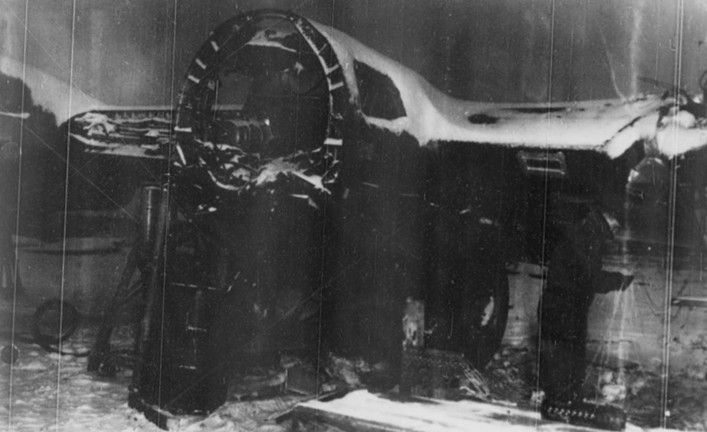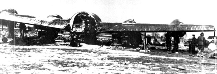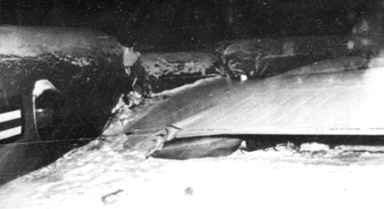 The aircraft impacted a small rise in the terrain with the imprint of the four engines in the snow-covered ground and immediately bounced. The aircraft hit again 270 feet ahead and was slightly heavy on the right side. It then slid 600 feet, made a turn to the right of 135°, and finally stopped after plowing through snow 14 inches deep. The tail section broke off aft of the center wing tank and was bent to the right 20°; however, it was intact with no buckling of the skin. The forward section, including the engineers’ compartment, also broke to the right just ahead of the wing, but was in excellent shape, indicating that the ship had flared out before hitting the ground. No windows were broken in the forward section, and the windows were still fully operational. The forward section had little damage and was reported in “excellent shape.” There was no fire. The official accident report noted that the propellers were bent forward, indicating 2,3,4, engines were running and producing power at the time of impact.