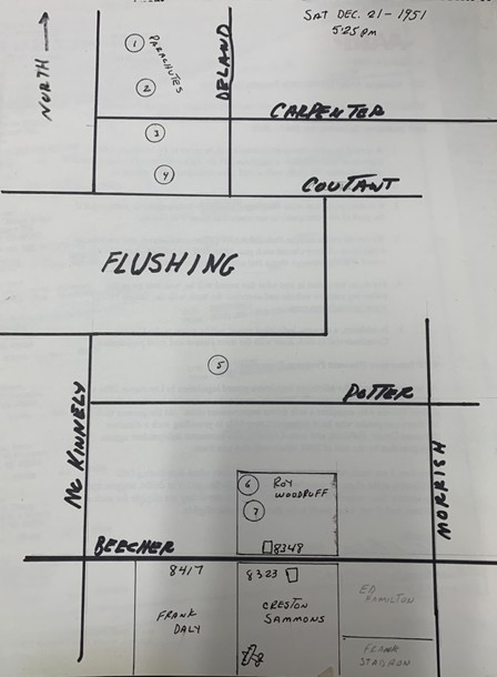 The aircraft crashed at 5:25 pm EST, only about 15 minutes after the first engine trouble started and ½ mile from the point where the last man parachuted. The B-29 Superfortress Bomber crashed 5 ½ miles northwest of the Flint Airport and two miles south of Flushing, Michigan. The B-29 bomber crashed across snow-covered farm fields, including the Creston E Sammons Farm, located at 8323 Beecher Rd. The crash site was constrained by Beecher Rd, McKinley Rd, Marrish Rd, and Cackins Rd.